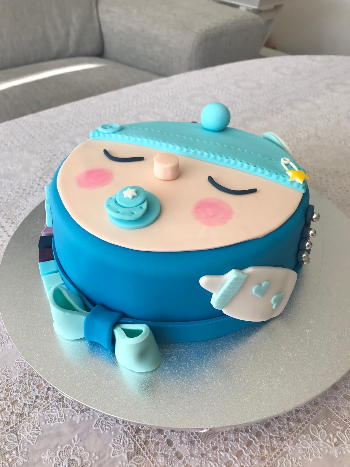 Dette er foreløpig min favorittkake, da jeg synes den ble så utrolig søt og stilig. Min første ordentlige designkake kanskje, eller min "signaturkake". Egner seg som babyshower-kake eller en litt annen type dåpskake. Kan selvfølgelig lages i rosa eller andre farger.